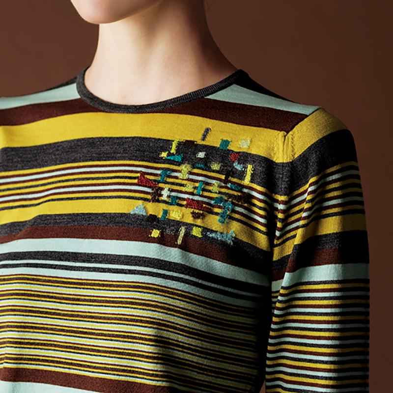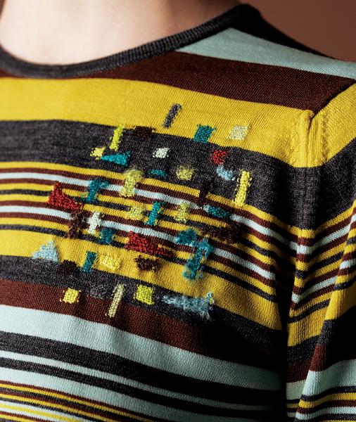 土台となったマルチストライプのセーターは肌触りのいい100%ウール製。そんなスムースな表面に深みを出すため、ざらっとした質感のラムウールや、ちょっと起毛するキッドモヘアの糸を選びました。刺す面積も小さいので、緻密作業に息が詰まる前に数個仕上がりますし、いつでも刺し増やせるのも嬉しいです。