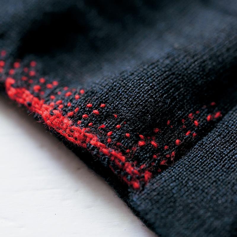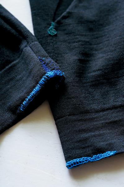 今回のお題は、イギリス製の濃紺のカーディガン。さらっとした肌ざわりの上質なウールで、四季を通じて着られることもあり、細部の傷みが目立ってきていました。シックな装いが得意なオーナー様と、「ちょっと遊び心」を希望される奥様のバランスを取りながら色選びをしてみました。イメージは、イギリス男性の、ピンストライプのダークスーツの裾からちらりとのぞく真っ赤なソックス。いかがでしょうか?