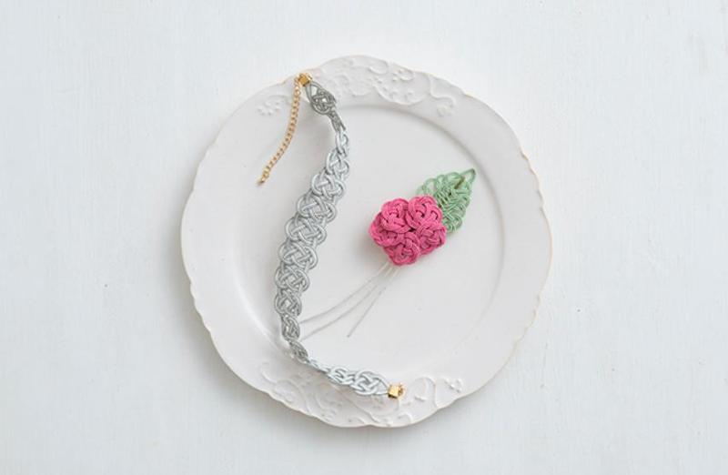 連続あわじ結びのブレスレットと、連続梅結びのブローチを作ります。