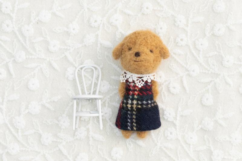 ループヤーンを使ったクルクル巻毛のプードル。チェックのワンピースにおしゃれなレースの襟が似合います。羊毛フェルトの基礎から、クルクル巻毛のテクニックも学べます。