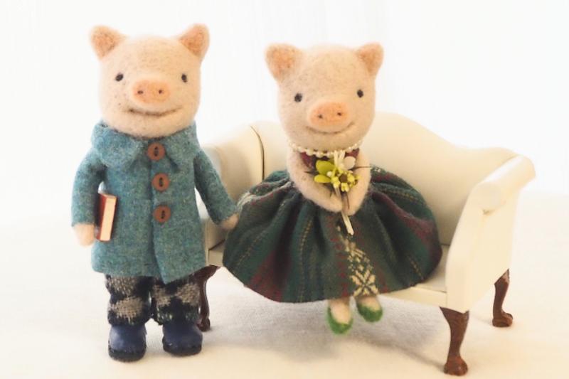 レトロなお洋服が大好きなピンクのブタさん。かわいらしい手とにっこり笑顔がポイントです。