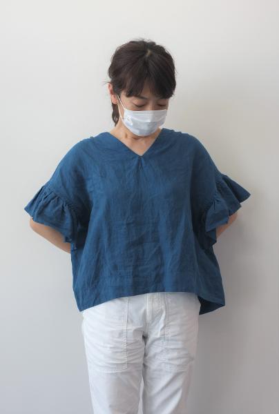 フリルは輪に縫わず下側で切れているので、ヒラヒラと泳ぐ感じ。なんだか着心地も涼しい気がします。二の腕がしっかり隠れる袖丈なのも安心。これからの季節、出番が多くなりそうなアイテムです。