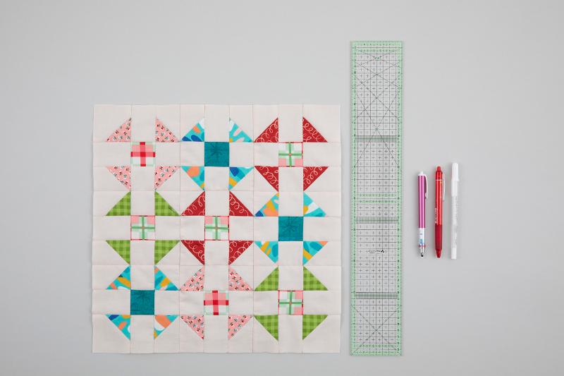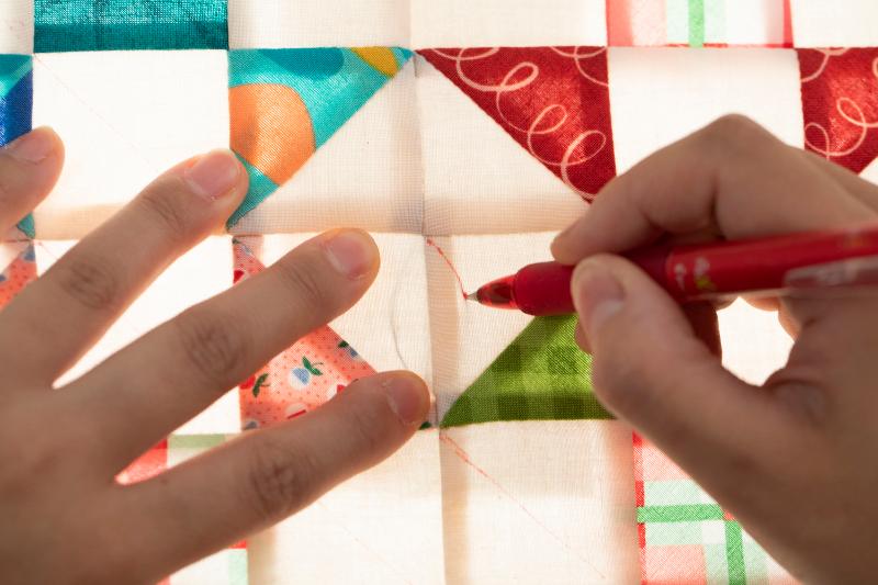 2、 直線を引く時は長めの定規がおすすめ。縫うと多少のゆがみが出ますが、そういう時は角と角が合うように調整しながら線を引きます。下にやすりボードを敷くと布が動かずきれいに描けます。
