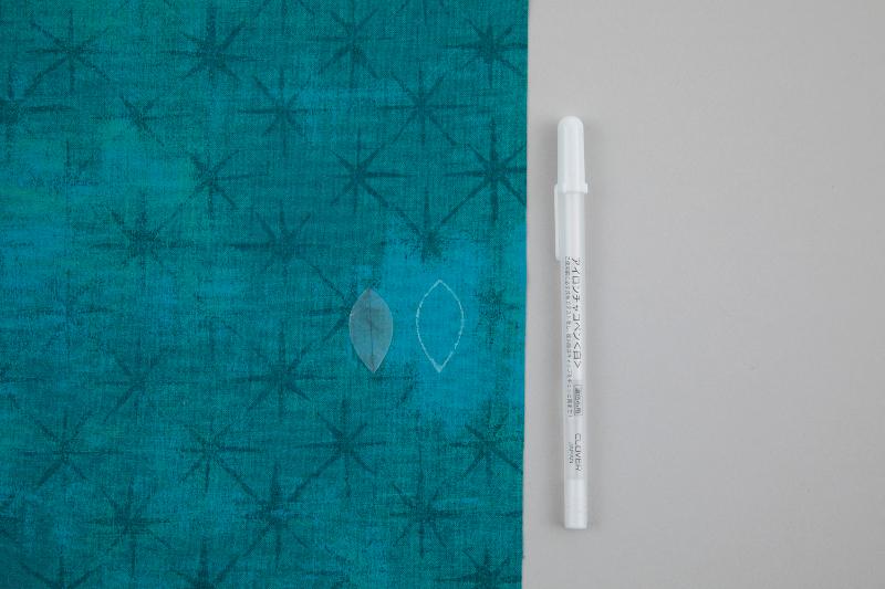 5、 濃い色の布にはアイロンチャコペンが便利。描いてしばらくすると線が白く浮き上がります。アイロンをかけて印を消します。