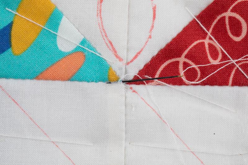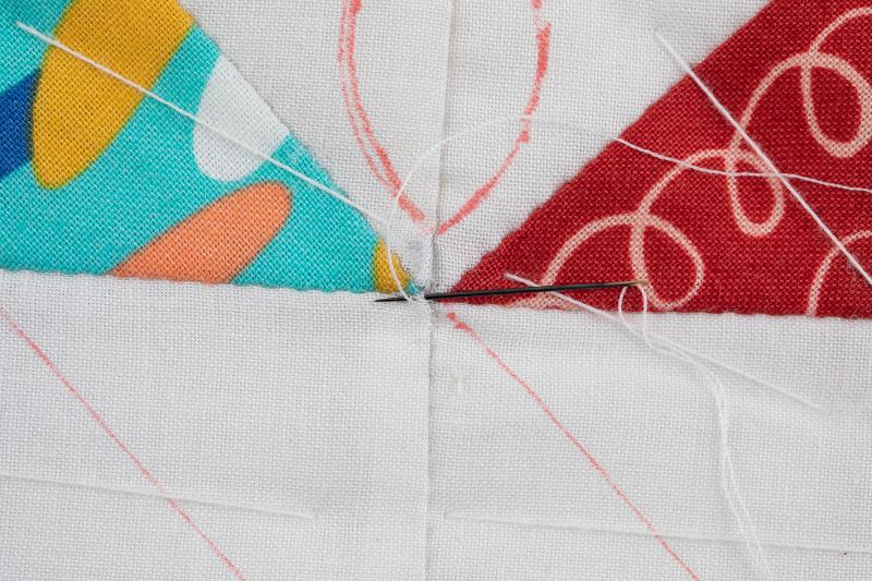 3、 中央部分の落としキルトから始めます。刺し始めは玉結びを作り少し離れたところに針を入れ、キルト綿の中をくぐらせ、刺したい部分の一目先に針を出します。