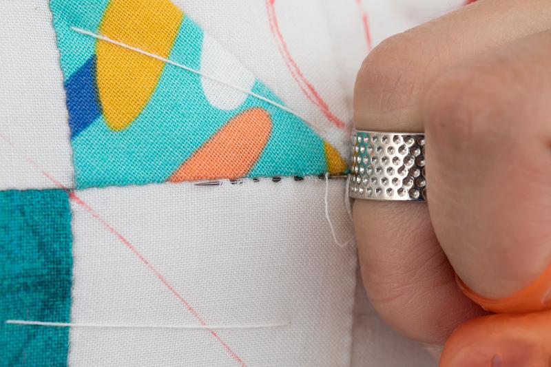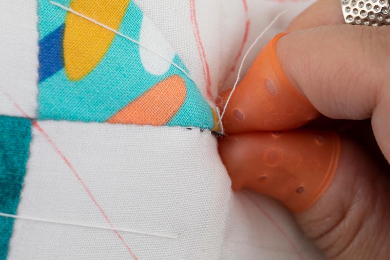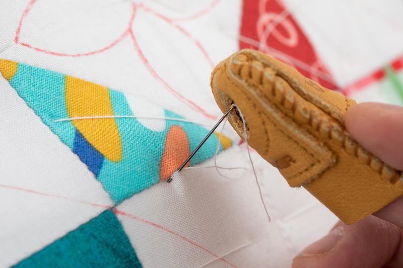 6、 上から針を垂直に刺し、もう片方のシンブルをはめた中指で下から針先を持ち上げ、短い針目でキルティングをします。布に針を斜めに刺すのではなく垂直に針を刺し垂直に出すことで、キルティングの凹凸がきれいに出ます。