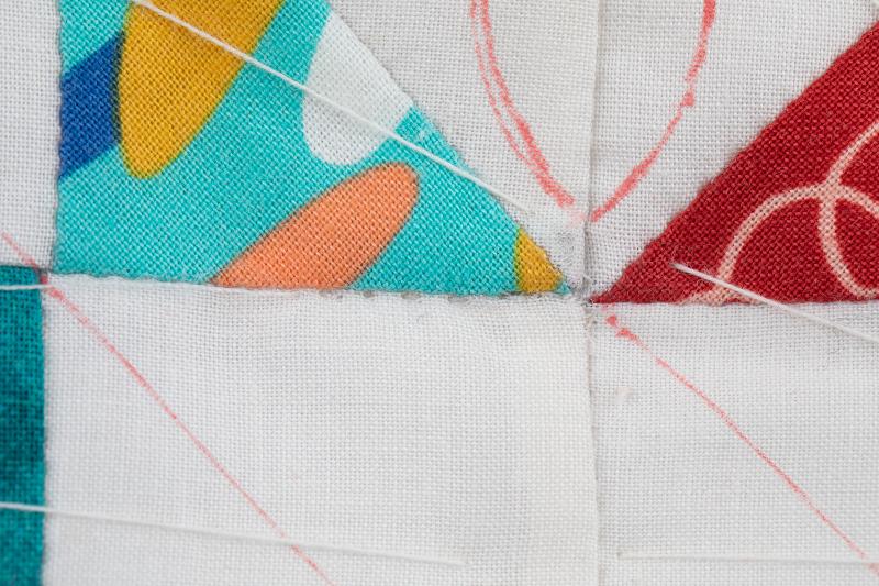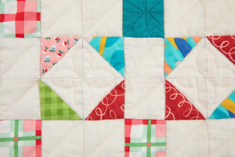 9、キルティングしたところ。縫い終わりは縫い始めの逆の要領で、3層をすくう返し縫いとキルト綿のみすくう返し縫いをして、玉止めをせずに糸を切ります。