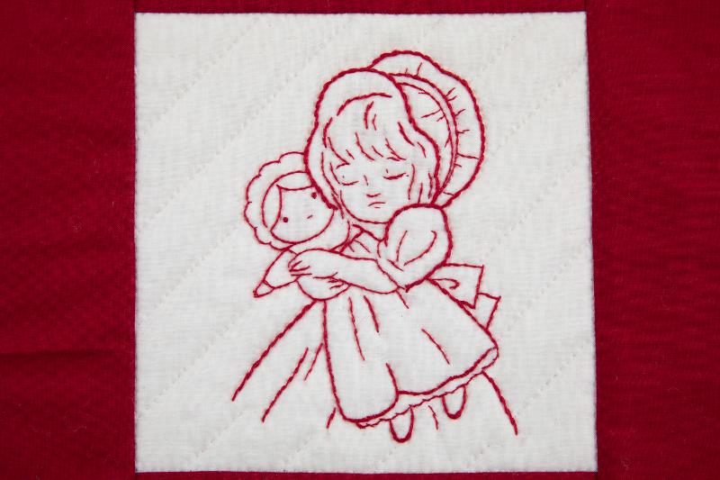 <刺しゅうのある部分のキルティング>刺しゅうの外側の際に落としキルトをすると絵柄が浮き立ちます。細かくキルティングを入れすぎると刺しゅうの形が変わってしまうこともあるで、顔など細かい部分はすべてにキルティングする必要はありません。