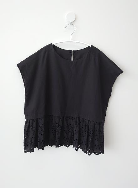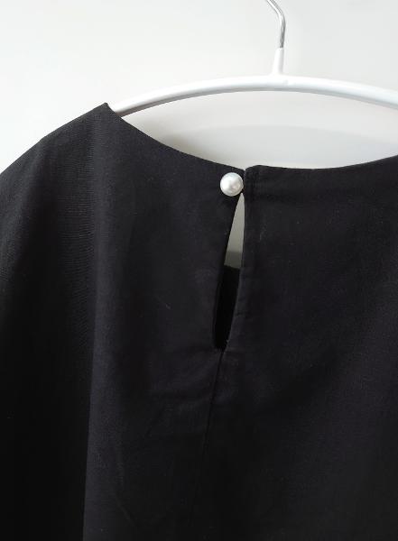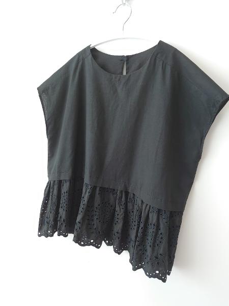 耳がスカラップレースになった布を使い、ギャザー布をレースで部分で取りました。コーディネートのしやすさを狙っての、黒です(着やせも期待)。