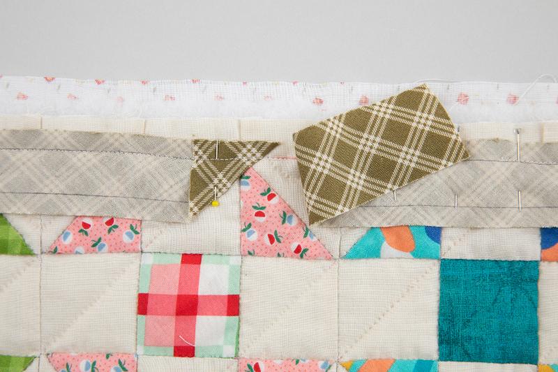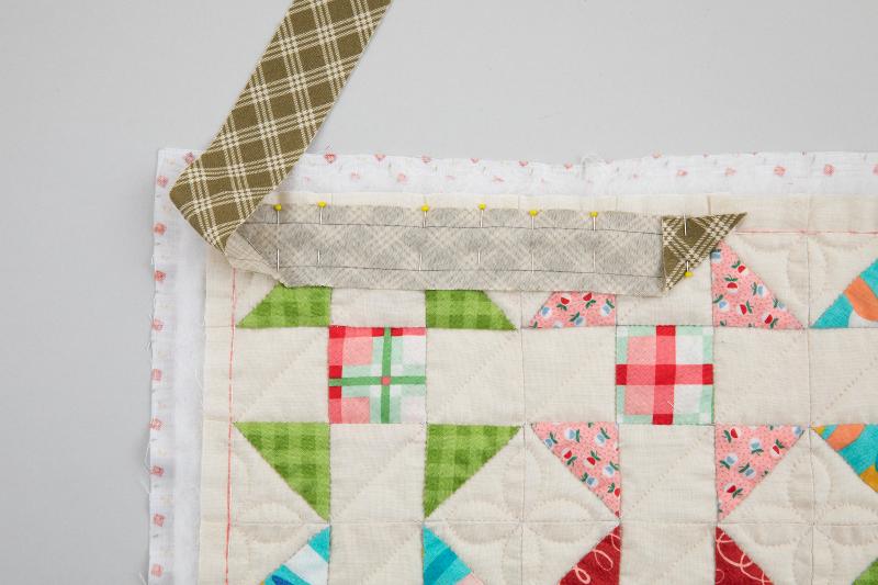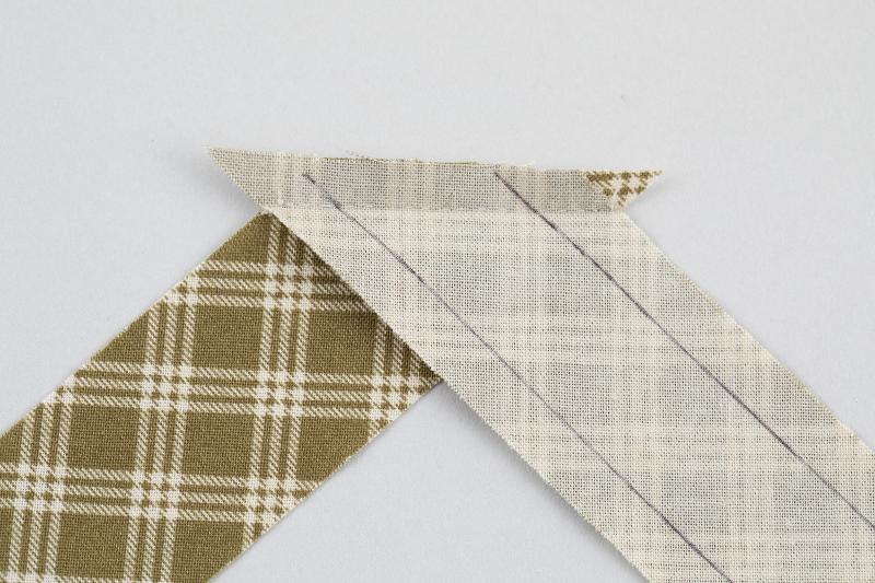 4、キルトに仕上がり線を引き、その上にバイアス布の縫い線を合わせ、まち針を打ちます。最初の部分は三角形に折ります。