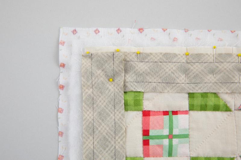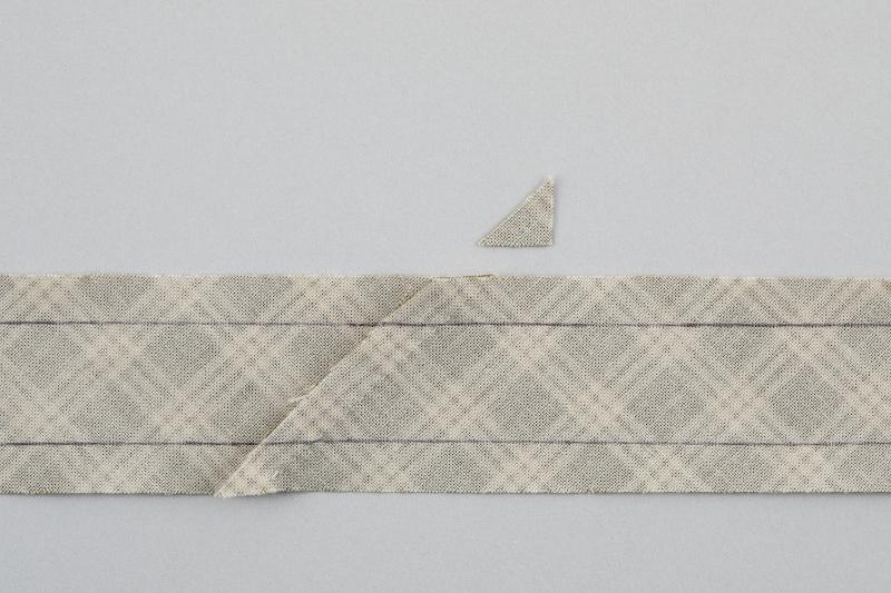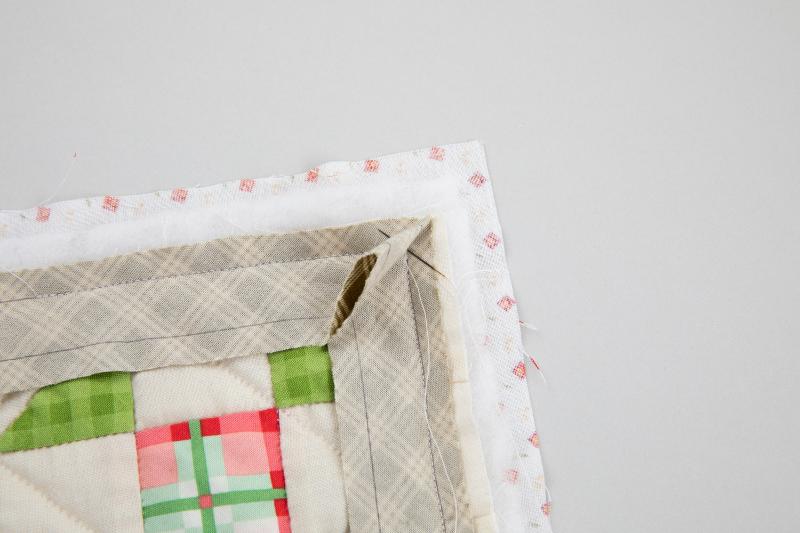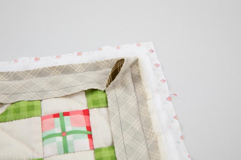 6、三角に折った頂点から、縫い始めに返し縫いをして線上を縫い、角の少し手前のバインディングの内側の角で返し縫いをして縫い止まります。他の3辺も同様に縫います。
