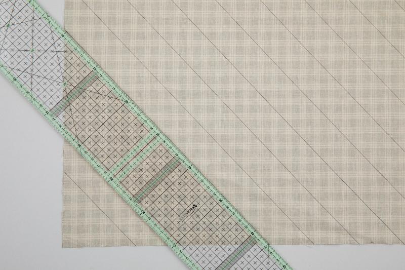 1、バインディング用布の裏に、バイアス方向に線を引きます。ここでは仕上がり0.9㎝幅で作るので、3.5cm幅です。チェック柄を使う場合は柄をななめにとるときれいです。