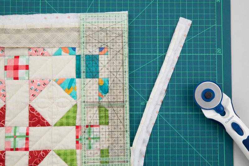 9、縫い代0.9㎝残して、周囲の余分な布をカットします。ロータリーカッターと定規を使うと便利です。