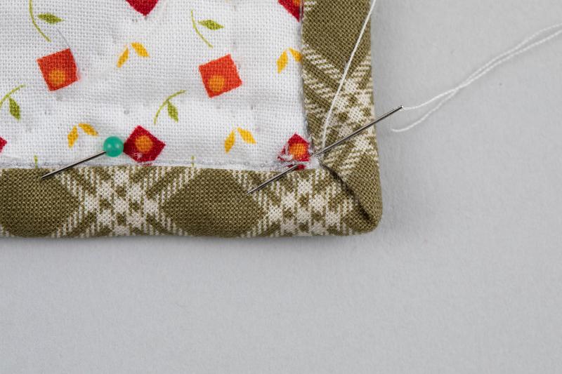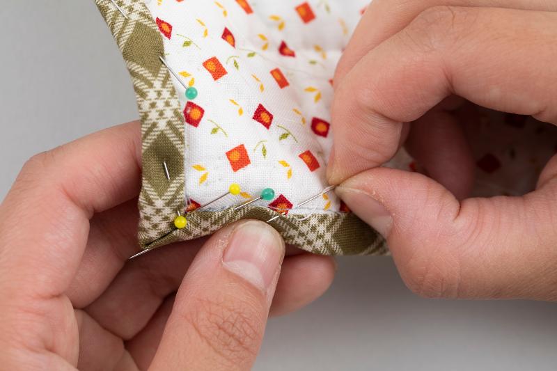 10、裏返してバインディング用布を折り返し、まち針を打ってまつります。