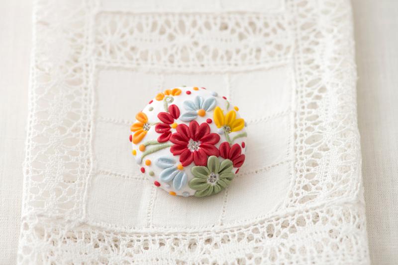つまみ細工のような立体感のあるお花がかわいいブローチです。