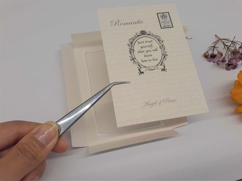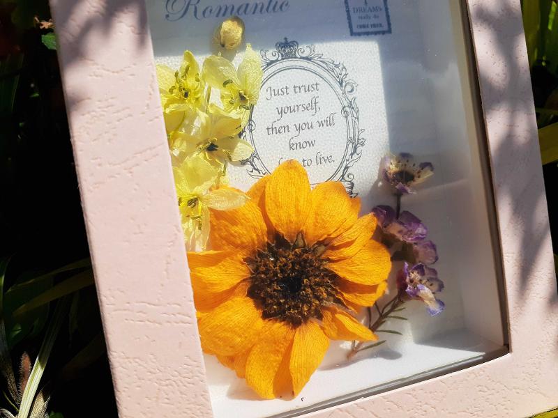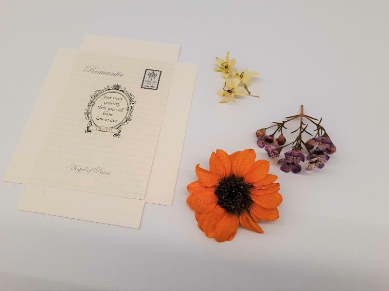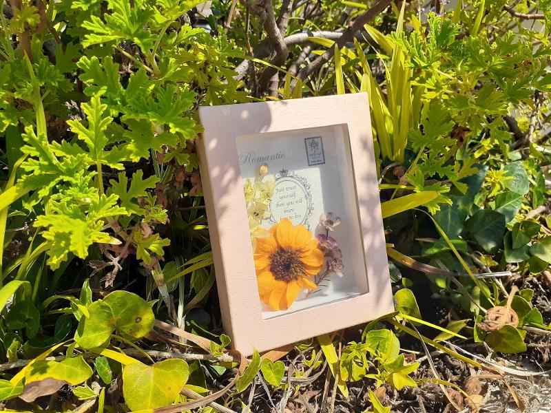 こちらは紙製で、手軽につくれる教材のひとつです。サイズも小さく、L版の写真と同じくらいです。お花は前回の記事で掲載したお花を使用しています。