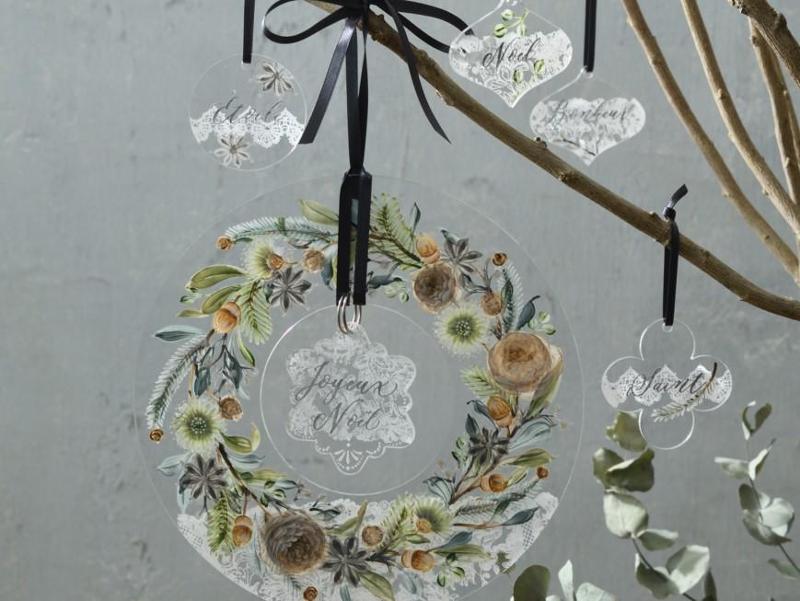 透明なアクリルのリースに、シックなアースカラーで、モミの枝、ユーカリ、シダーローズ、ドングリ、松ぼっくり、スターアニスのリースを描きます。初級~中級のテクニックで描けます。ドライフラワーのイメージでシンプル&ナチュラルなインテリアに合わせてもおしゃれ。素材が透明なので、実物大カラーコピーを下に敷いて描いていくと便利です。レースとモダンカリグラフィーの文字は、シルクスクリーンを使ったプリントで、手軽に仕上げられます。レース模様は、裏面からシルクスクリーンをプリントします。