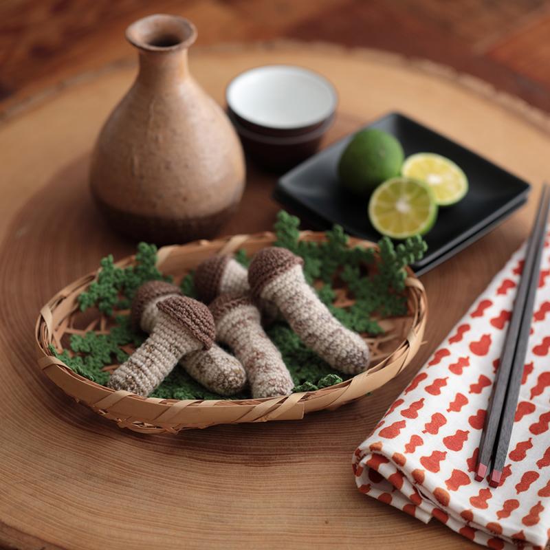 大・中・小とサイズもいろいろな高級キノコ。細編みと中長編みを組み合わせた編み地で、松茸の曲がり具合を絶妙に表現しています。