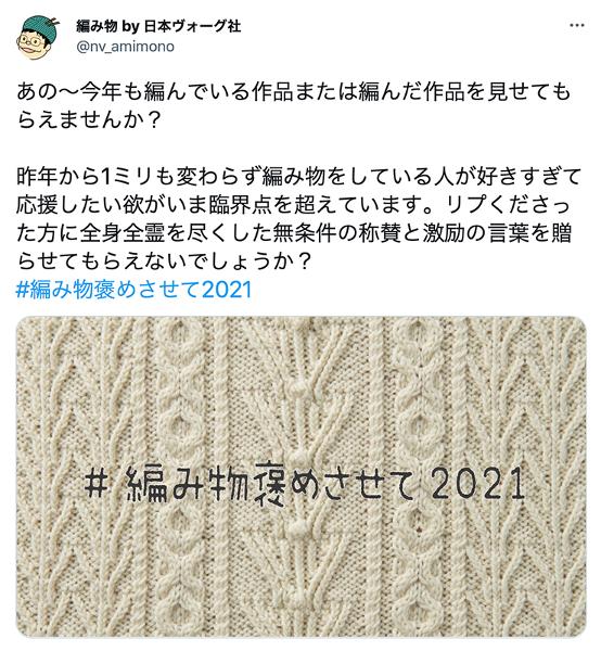 みなさんの編んだ作品を、編み物 by 日本ヴォーグ社のTwitter(@nv_amimono)の投稿に #編み物褒めさせて2021 のタグをつけてリプくださった方に編み物の妖精さんが全身全霊を込めてお返事させていただきます!