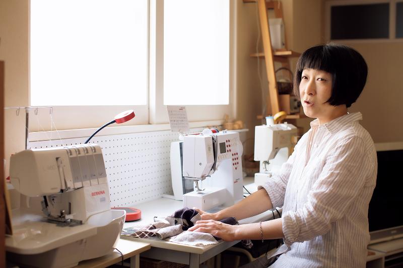 「小さな端切れも捨てられないので収納が悩み」と言うが、あらゆる道具が使いやすいように整えられている。ここで開く教室は、生徒それぞれが作りたいものを形にするのを手助けするスタイル。