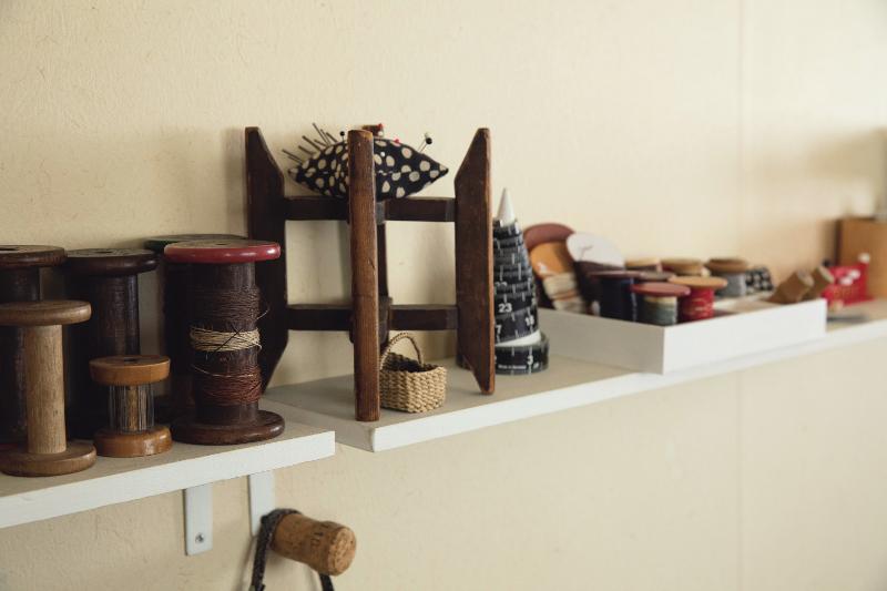 壁の棚には、実用の糸や用具を古道具と一緒に並べて。