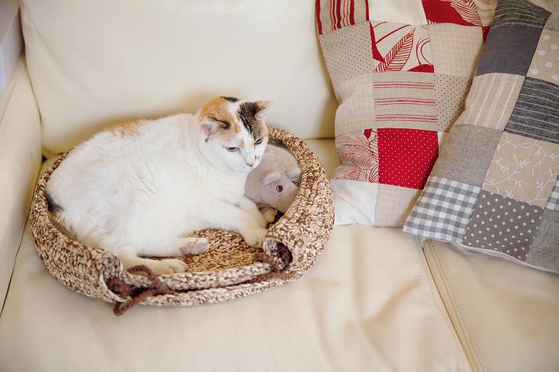 かぎ針編みのバスケットにすっぽりとはまっているのは愛猫、ミケコさん。
