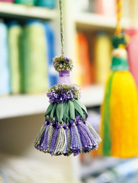 A.F.Eには、光沢とドレープ性に富んだレーヨンを鮮やかに染め上げたタッセル房糸と、その半分の細さの極細タッセル房糸がそろっている。タッセル用の小物も豊富で楽しい。