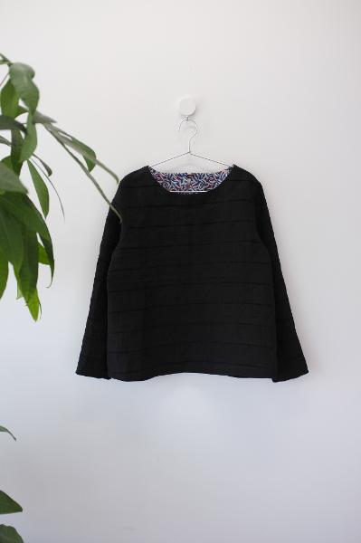 メインの生地は無地でもニュアンスのあるリネンモールボーダー生地、見返しとボタンには肌触りのよいリバティファブリックのタナローンを使っています。