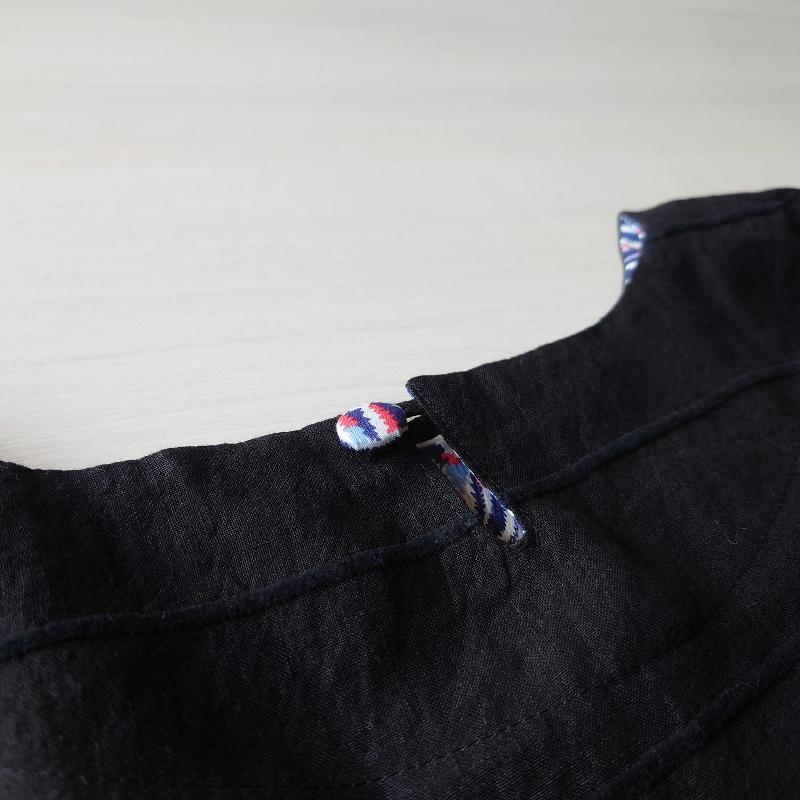 後ろあきのボタンは、見返しに使ったリバティと共布でくるみボタンをつけてみました。