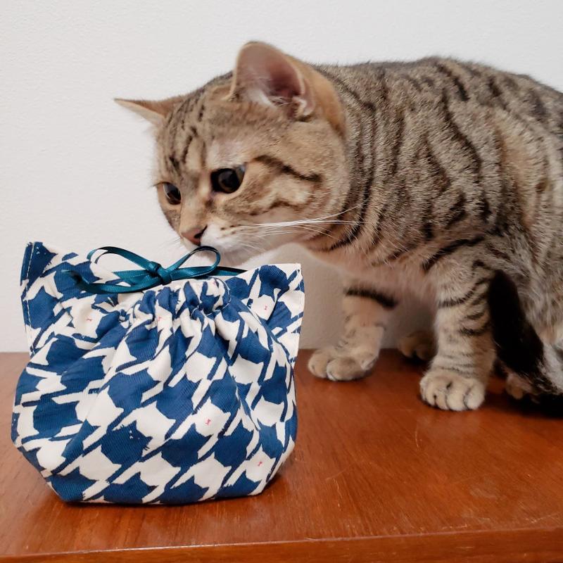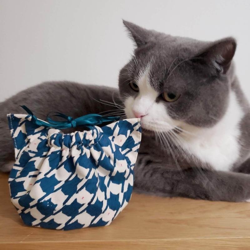 三角に作った耳を挟んで縫うだけで、かわいいネコ型巾着に。
