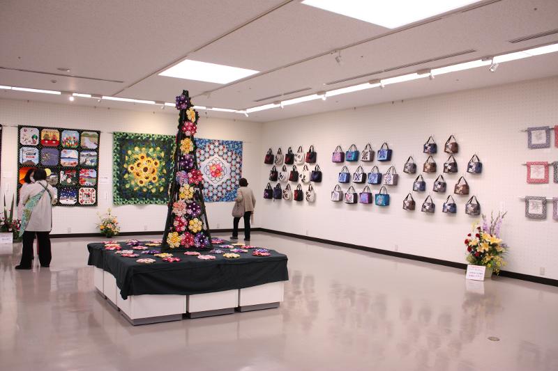 公民館の生徒さん作成の小ものと合わせ、指導先生方の作品も展示されていました。公民館の生徒さんからは技術力を問われない気軽に作成できるものが人気とのことで、ギンガムチェックが効いた花刺しゅうミニタペストリーや、落ち着いたカラーを使用して普段使いしやすいデザインのハワイアンキルトのバッグなどが会場を彩っていました。その他、刺しゅうのバッチやミニ財布のワークショップも開催されており、賑やかな展示会となっていました。