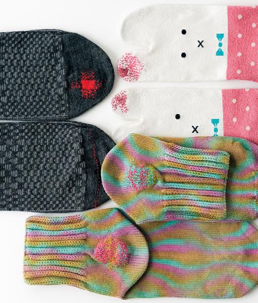 靴下のダーニングには、生地と同じような厚さ、もしくは若干太めの糸を使うとよいでしょう。靴下用の化繊混合率の高い毛糸なら丈夫ですし、絹の靴下には絹の穴糸がお勧めです。また、モヘア混の毛糸は動物性天然繊維の中で断トツに強靭で撥汗性が高く、ダーニングにぴったりです。繕ってもまた同じような箇所が擦り切れてしまう場合は、穴があく前に違う色で半返し縫いのゴマ塩ダーニングを施すとよいでしょう。カラフルにダーニングした靴下を履けば、靴を脱いだ瞬間にニンマリしてしまうこと間違いなしです。