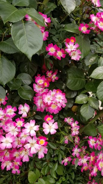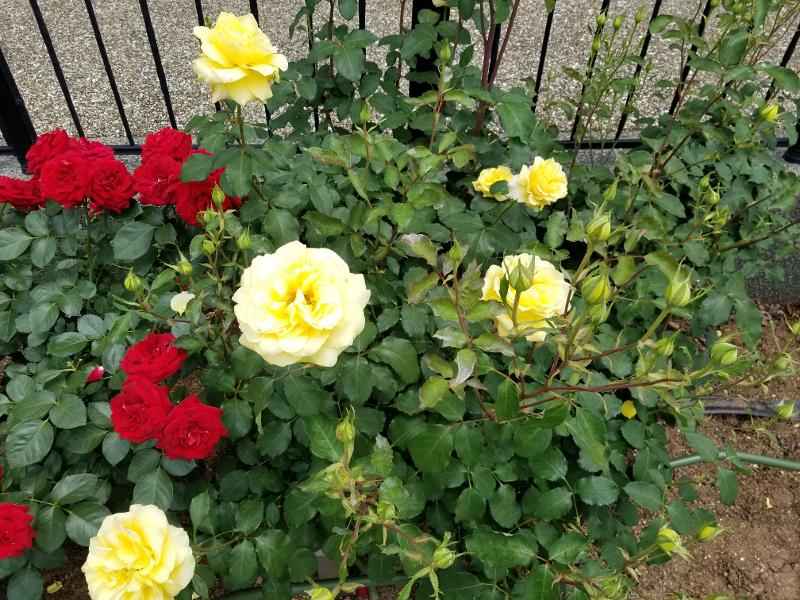 建物周辺の花壇には色とりどりのバラ