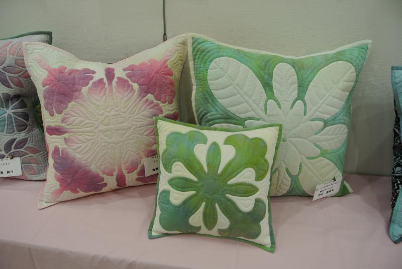 むら染めの生地を使って制作したハワイアンキルトの絶妙な色合いとデザインはどれも素晴らしく、来場者は作品の前で足を止めて1点ずつ鑑賞していました。今回は教室10周年の記念の展示会となり、これを機に教室名を「Naomi Quilt」に改名したとのこと。飯田さんはライフワークとしてミシンを使ったミニチュアキルトの制作にも取り組んでいるそうで、会場ではミシンキルトのデモンストレーションも行われました。