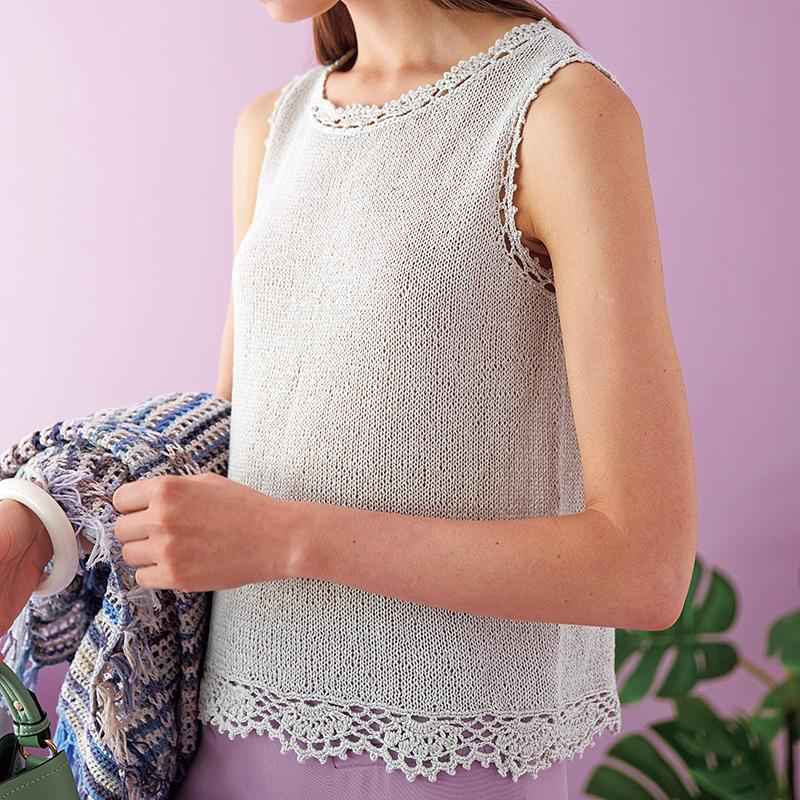 メリヤスベースのノースリーブにかぎ針あみの縁編みをつけた、シンプルで合わせやすいノースリーブプルオーバーです。デザインは岡本啓子さん。