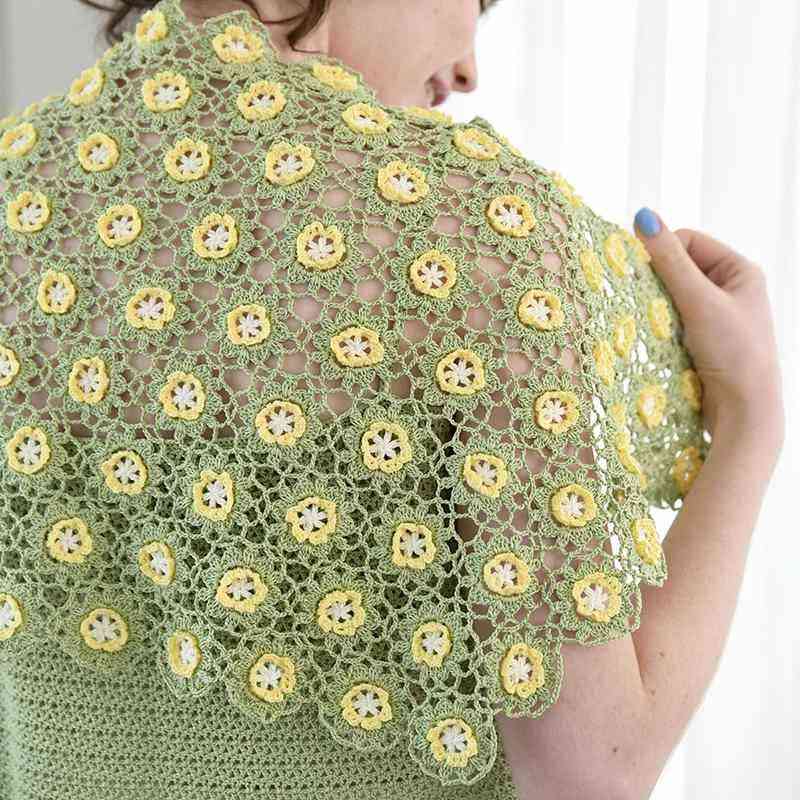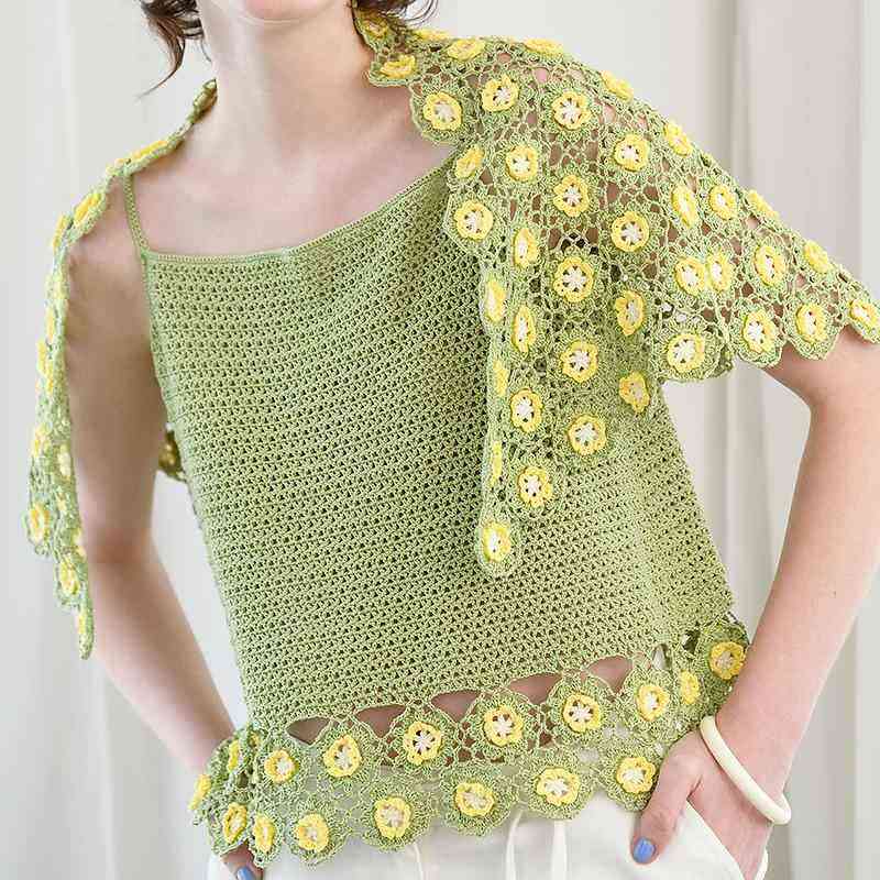 シンプルなキャミソールの裾にぐるりと、立体的な可愛いモチーフつなぎのお花を並べて。キャミソールはそのまま着たり、セットのショールと合わせたりするのはもちろん、Tシャツに重ねればカジュアルな着こなしに。流行の透け感のあるシアーシャツを上に羽織れば、うっすら透ける黄緑が一層涼しげな印象になりますよ。デザインは伊藤直孝さん。