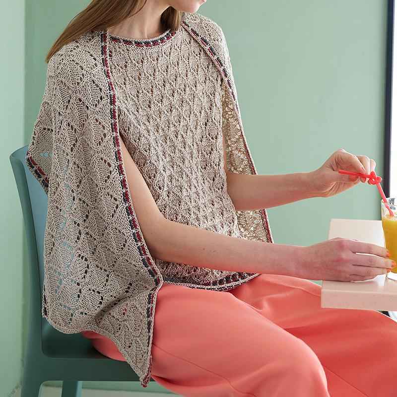 透け感と大人のトリコロールカラーが魅力のフレンチスリーブのプルオーバー。お揃いの台形ショールを羽織って、肌寒い朝や冷房の効いた室内でもおしゃれに体温調整を。ちょっとしたお揃い小物が楽しめるのは、手編みの醍醐味です。デザインは岡本真希子さん。