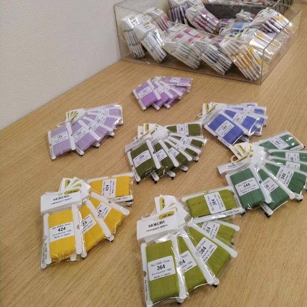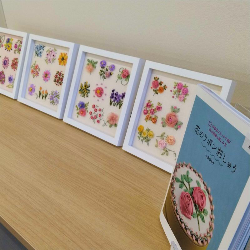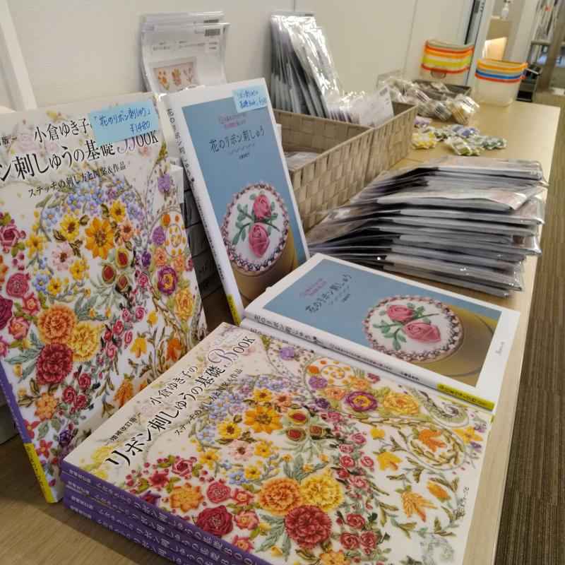 会場の前では、小倉先生の過去本や、今回の新刊に掲載している作品のキット、リボン刺しゅうの材料なども販売。華やかで繊細なリボン刺しゅうは、見ているだけでも癒されますね。