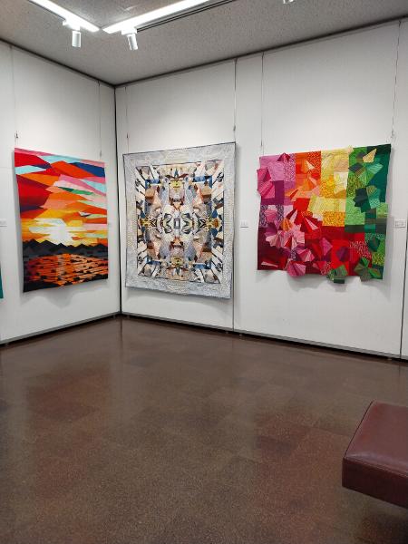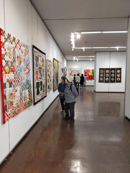 すっきりとした透明感のある配色の作品作りを心掛けているそうで「無事に展示が開催できてホッとしています」と津田さん。展示会場が美術館ということもあり、天井が高く照明もキルトをきれいに照らして、キルティングの一針一針まで鑑賞できる展示会となりました。