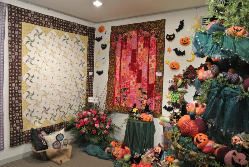 中でも目を引いたのは、画廊「岳」会場を入ってすぐの季節感あふれるハロウィンの展示で、カボチャやオバケの賑やかなオーナメントが来場者を迎え、普段手作りをする人はもちろん、初めて訪れた人もキルトの世界を楽しめる工夫を凝らした空間が演出されていました。