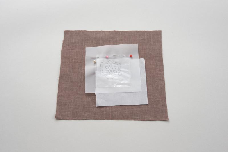 チャコ面を下にして、布とトレーシングペーパーの間に手芸用複写紙をはさみます。