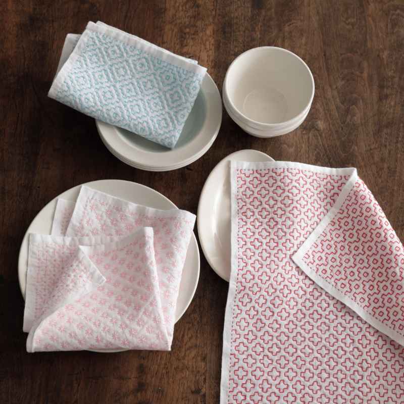 作品づくりに使える白いふきんと、sashikonamiさんセレクトの愛らしい色合いのオリムパス刺し子糸。