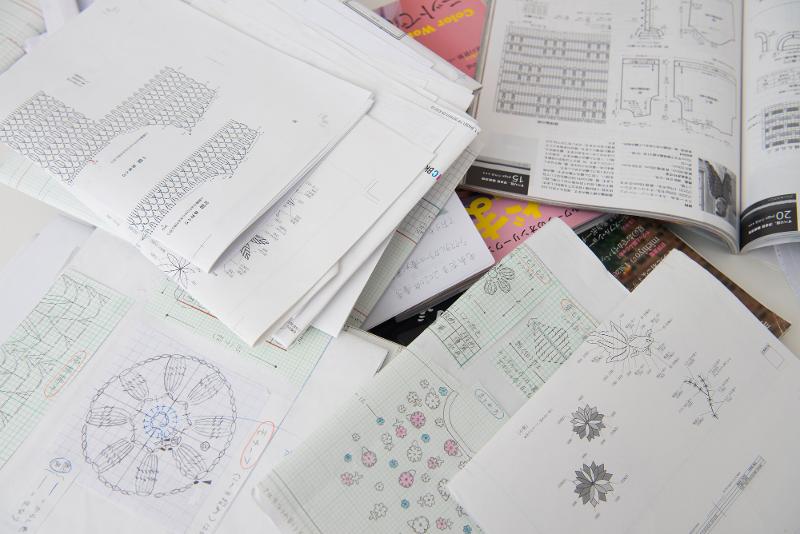 読者が図を見て同じように編めるようにするというのは、数学の証明問題を解くようなもの。すっきりと整理できた時は不思議な快感さえあります。頭の中で何枚も作品を編む工程は本当に地味ですが、どう編んでいるのかを探り、確かめていくという面白さもあります。