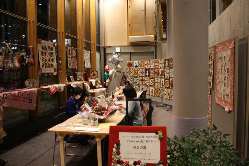 教室の展示会は夏に開催される場合もありますが、12月の開催ではクリスマスの作品が会場を飾り、一層賑やかで楽しい雰囲気になったとのこと。ガラス越しに外の通りからよく見える展示の様子に足を止める人も多く、キルトの楽しさを広く伝える展示会となりました。