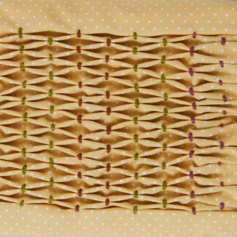 ステッチの糸を引いて布にひだを寄せながら刺すスモッキング。