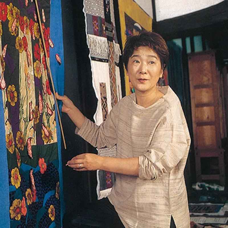 【プロフィール】1944年大分県大山町に生まれる。1966年福岡県三井郡北野町の天保年間から続く造り酒屋に嫁ぐ。1970年古布を使って、刺し子風の継ぎ合わせを始めるが、独自の尺貫法を用いる。1980年「藍公房」を主宰。1982年アメリカのナショナル・キルト連盟レディバグ主催のキルト大会に招待され、6点を紹介。全作品が入賞、内3点がブルーリボン賞を受賞。ワシントンDCで開かれた駐米大使主催の日米協会レセプションに招待出展。2000~01年日本巡回展(主催・朝日新聞社)。「藍公房」を「矢口玲子デザイン室」に改称。著書に『花裂あわせ』(日本ヴォーグ社刊)、『21世紀へ語り継ぐ山口怜子の世界』(朝日新聞社)など。