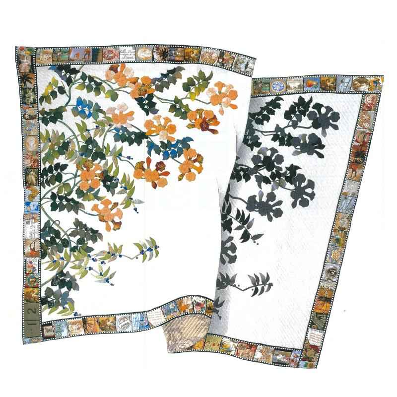 強い夏の日差しの中で咲くのうせんかずらに惹かれて、いつかはキルトにと思って作った作品。左側は咲いている様子を、右側は冬枯れの枝を表したかったのだという。庭に植えて観察してみると、冬になっても緑の葉は延々と元気で力強く冬越えする姿に圧倒された。そこで右側のデザインは夏の面影をグレーで、周りのフィルムは時の流れを写真の形で表現している。