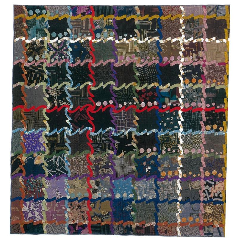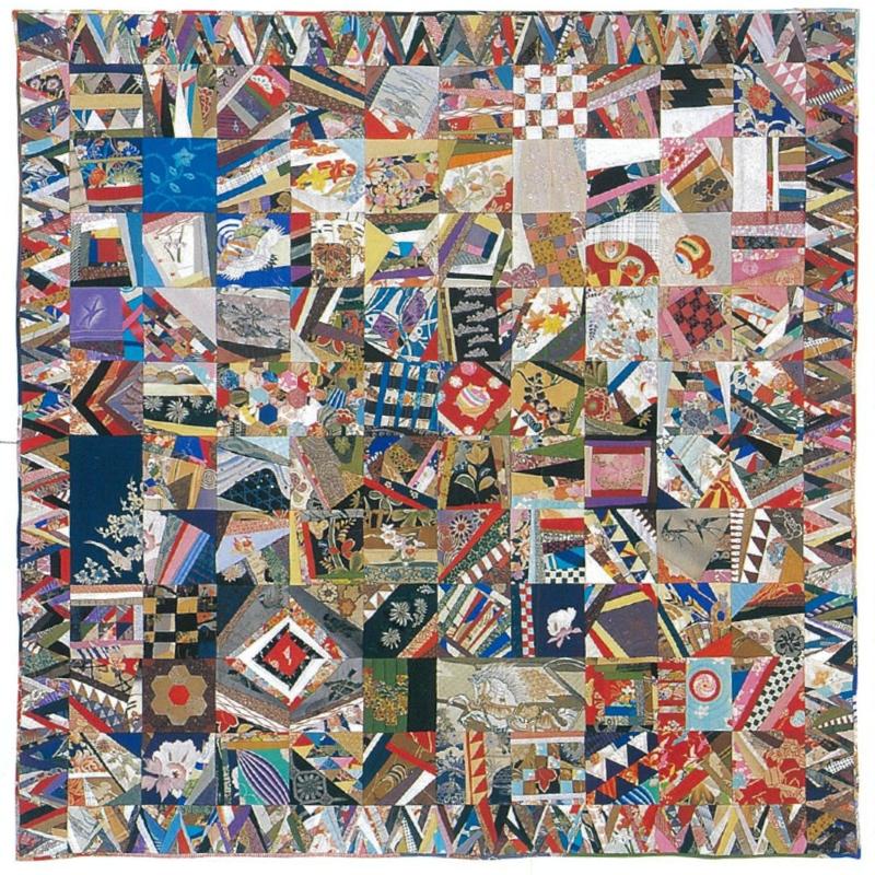 着物の絹地で作った最初の作品。父母、姉妹、祖父や祖母、祖父母の着物、初めて骨董市で買った着物など、思い出深い布がたくさん使われている。このキルトにはパッチワーク教室で習ったテクニックが多く活かされている。