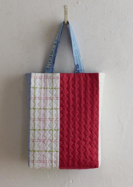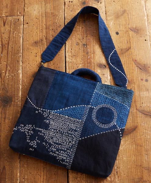 刺し子糸や刺しゅう糸で自由に刺し子ステッチをした2ウェイトトートバッグ。和久亞子さん。
