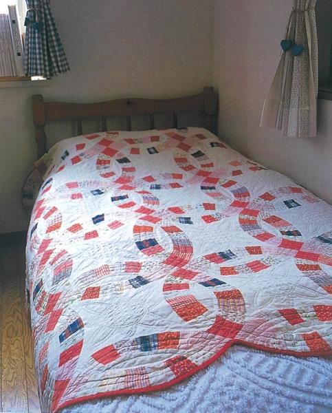 その当時、アメリカンコットンがあまり出回っていなく、コットンプリントで作ったというダブルウェディングリングのキルト。今でも家族で使われ続けているキルトは、鮮やかだった赤が時を経て優しい色合いに変化した。